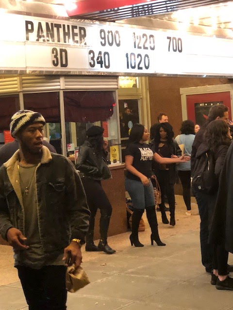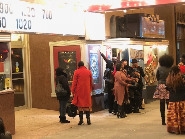 While waiting in line for this movie, the movie’s magic had already started to unfold: the people. Scores of theater goers from the previous show had started spilling out into the street and then it was evident. This is no ordinary movie. This was a hearty cultural celebration of a long awaited arrival: like a family member you had been waiting for, for a long time, but who never got the chance to visit you till now. Some were screaming “Wakanda” (to my ignorance I asked Alex, “what/who’s Wakanda?” Alex blinked (probably feeling sorry for me) and patiently explained)! Others posed outside with arms crossed in X’s and used their calf muscles to jigger up and down in unison, hinting at something that was probably from the movie. Several had worn beautiful, vividly eye catching African cultural attire while a few more donned Black Lives Matters-like attire and other additions that evoked the Black Panther movement. The diversity of the audience that had arrived to behold this feature film was deliciously refreshing. It felt like a special night, not your regular. I couldn’t even imagine what it must have been like to be at a larger venue tonight. I heard South Africa’s premiere was lit!
