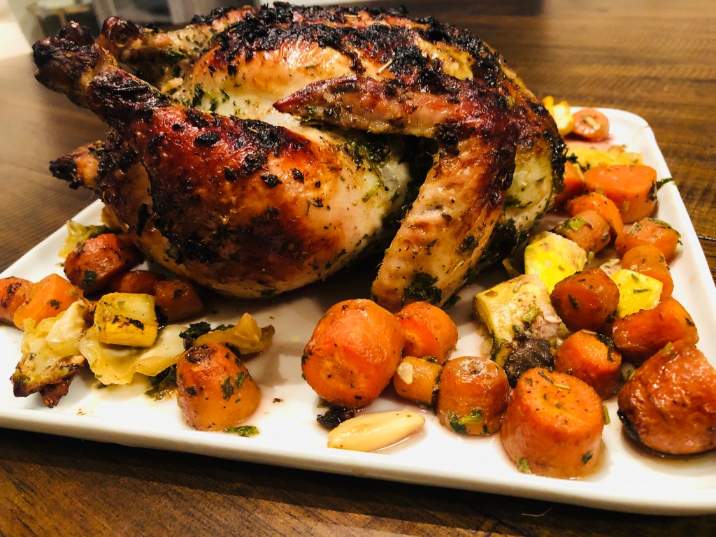 - Create a chopped vegetable bed for the baking pan, this can include carrots, potatoes, zucchini, squash, celery etc. Oil the baking pan and place the vegetable layer first. Then place the chicken on top and in the middle of the pan, breast facing upward. Put into the oven.